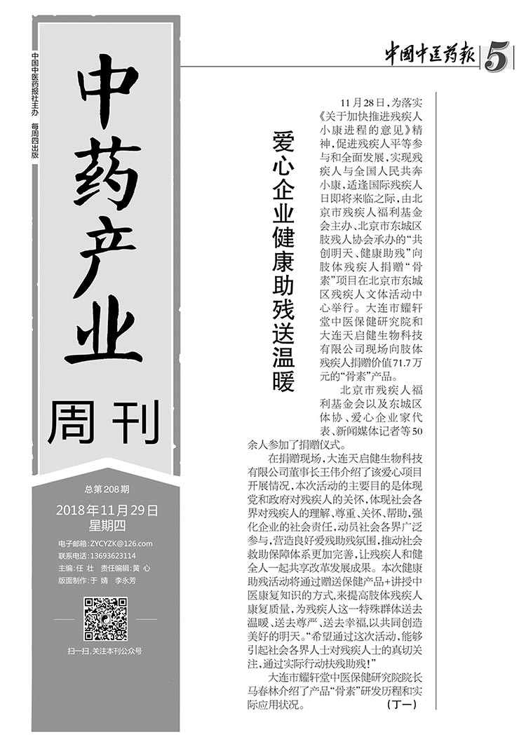2018年11月28日,值此國(guó)際殘疾人日來(lái)臨之際,大連市耀軒堂中醫(yī)保健研究院攜手大連天啟健生物科技有限公司捐贈(zèng)“骨素”項(xiàng)目啟動(dòng)儀式在北京市東城區(qū)殘疾人文體活動(dòng)中心,如期舉行。